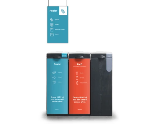 Circulaire inzamelmodule van 100% gerecycled polypropyleen uit bouw- en sloopafval en grofvuil. Doordat er bij de productie gebruik is gemaakt van gerecyclede kunststoffen heeft iedere unit een uniek uiterlijk. Modulair systeem. De module heeft een kunststof binnenemmer en is voorzien van een full front sticker. Ook mogelijk met enkel een deksel sticker en/of maatwerk full front sticker; vraag naar de mogelijkheden.