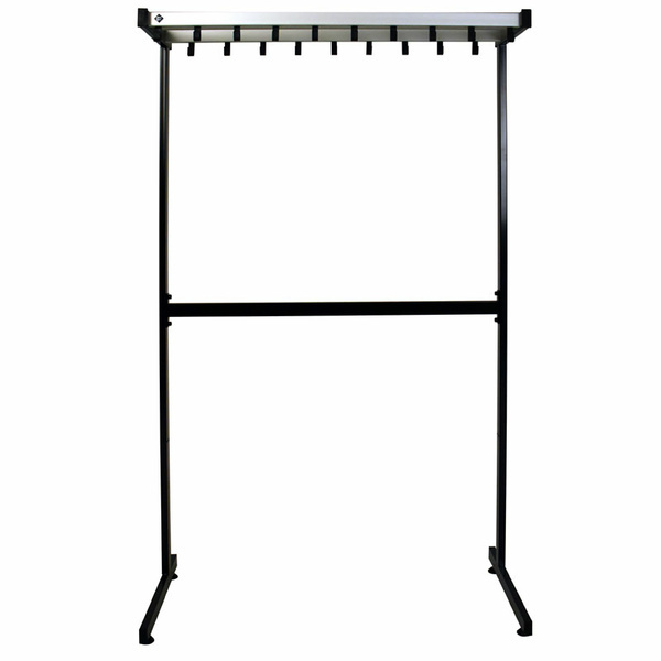 Vrijstaand garderoberek met 19 haken die in een rails onder de balk hangen. Mogelijk om garderoberek tegen de wand te plaatsen. Optioneel: kledinghangers om aan de buitenste rij haken te hangen en een wielen set.