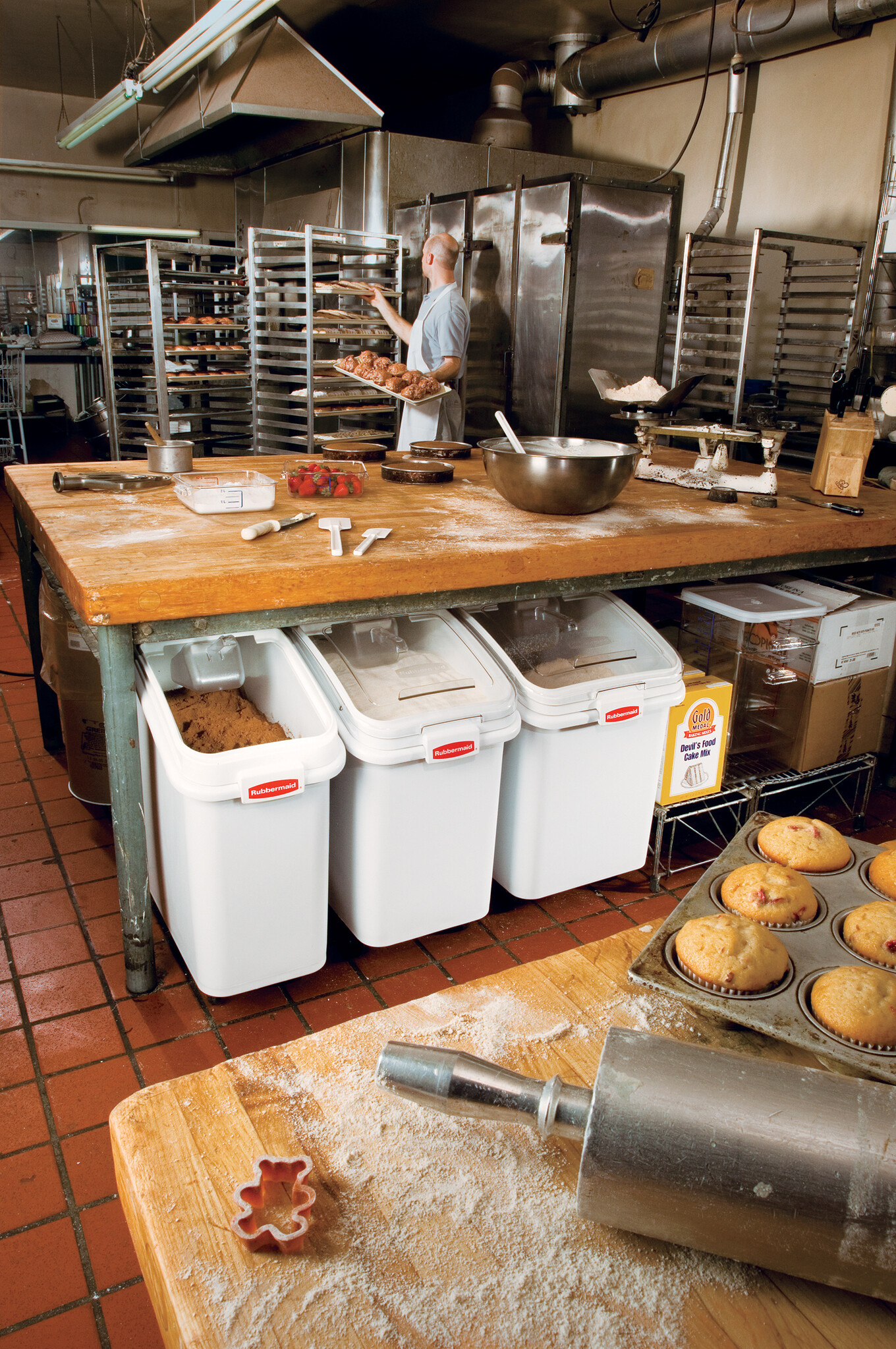 Voorraadsysteem op wielen, inclusief schuifdeksel en schep voor het veilig opbergen, transporteren en afmeten van voorraden. Het deksel klikt vast op de basis om de containers makkelijker te kunnen hanteren. De schephaak vermindert kruisbesmetting en zorgt ervoor dat de schep makkelijk bereikbaar is.