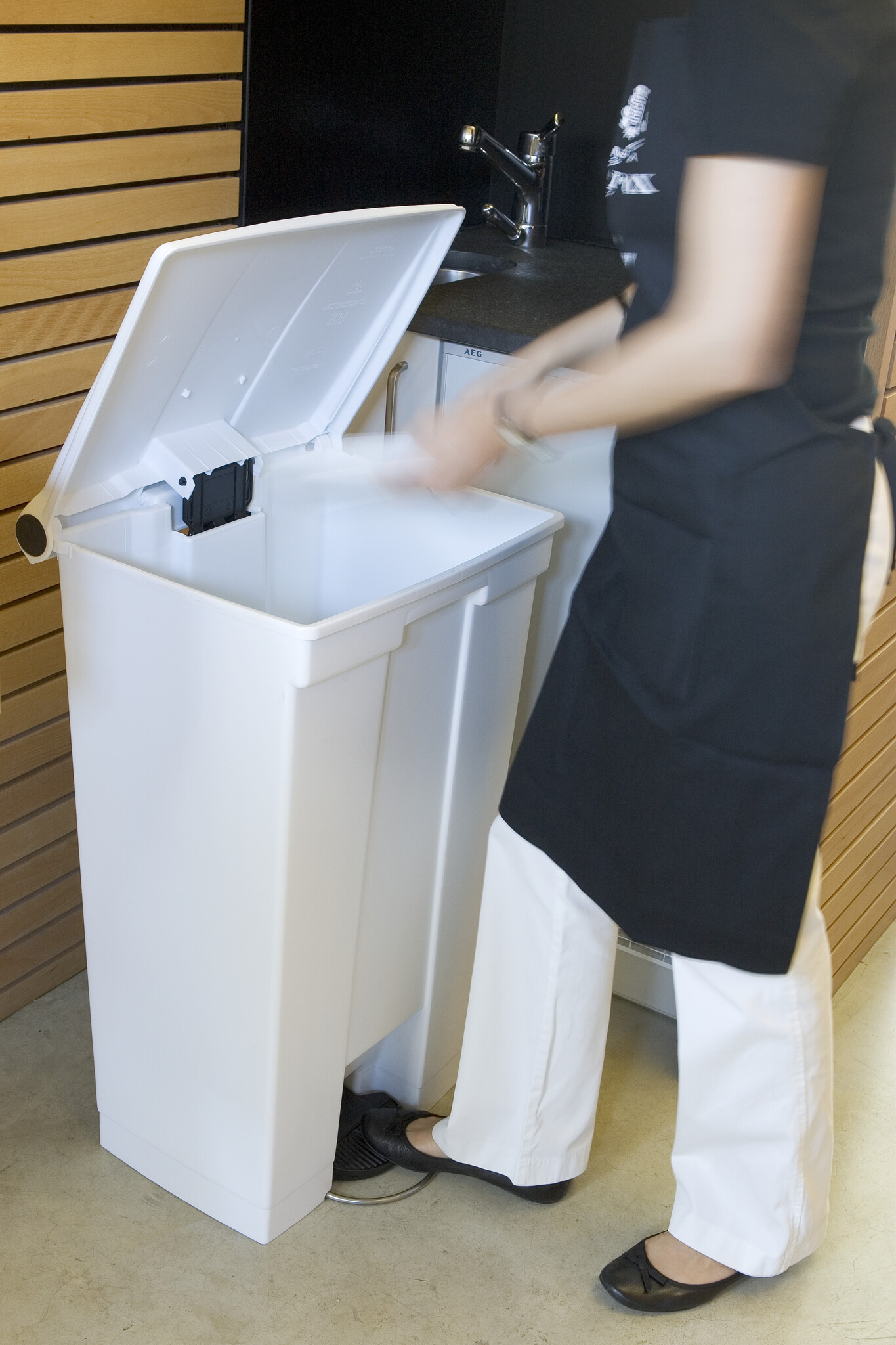 Robuuste container van polyethyleen met stil pedaal voor intensief gebruik. Deze sterke, lek-vaste pedaalemmer uit kunststof roest, deukt, splintert en schilfert niet. Ideaal om afval weg te gooien zonder het deksel te hoeven aanraken. Het strak sluitende, overlappende deksel houdt geurtjes binnen. De container heeft afgeronde hoeken en gladde oppervlakken voor een eenvoudige reiniging en desinfectering. Conform HACCP-richtlijnen.