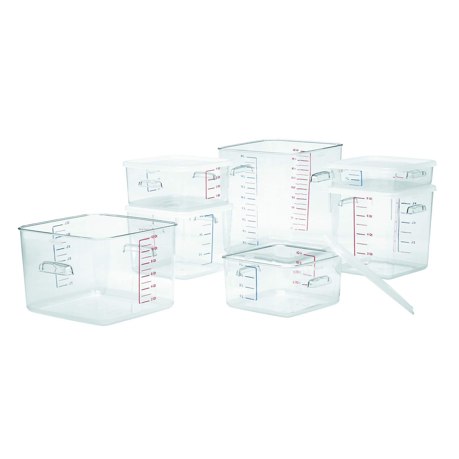In vierkante containers kan 25% meer worden opgeslagen op een schap dan in ronde containers. Verkrijgbaar in breukbestendig transparant materiaal voor zichtbaarheid of in duurzaam wit polyethyleen; beide versies hebben eenvoudig te reinigen, gladde oppervlakken. Beheer uw voedselvoorraad met gemakkelijk leesbare maataanduidingen – rood voor kwart gallon en blauw voor liter. Duurzame grepen voor eenvoudig transport en lekgaten voor handig afwassen en drogen. Temperatuurbereik voor transparante containers: -40°C tot 100°C. Voldoet aan HACCP-richtlijnen. Voldoet aan NSF- en EU-normen. Kan in de afwasmachine.