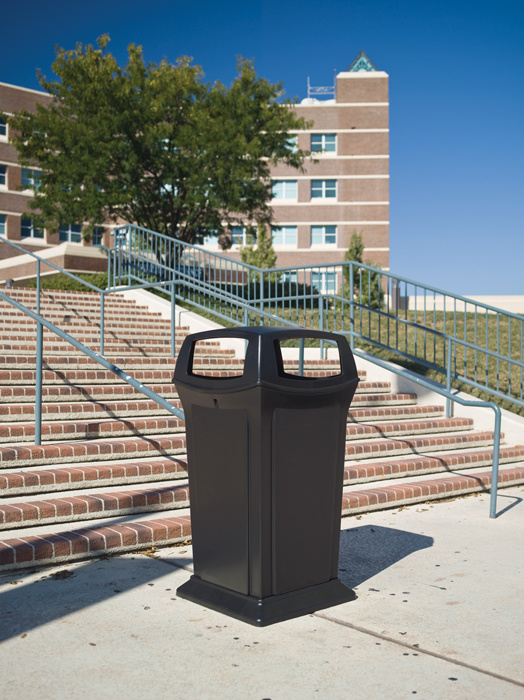 Vierkante Ranger container van hoogwaardig kunststof met 4 inworpopeningen en afvalzakhouder. De top is scharnierend. Optioneel: verzwaarde basis.