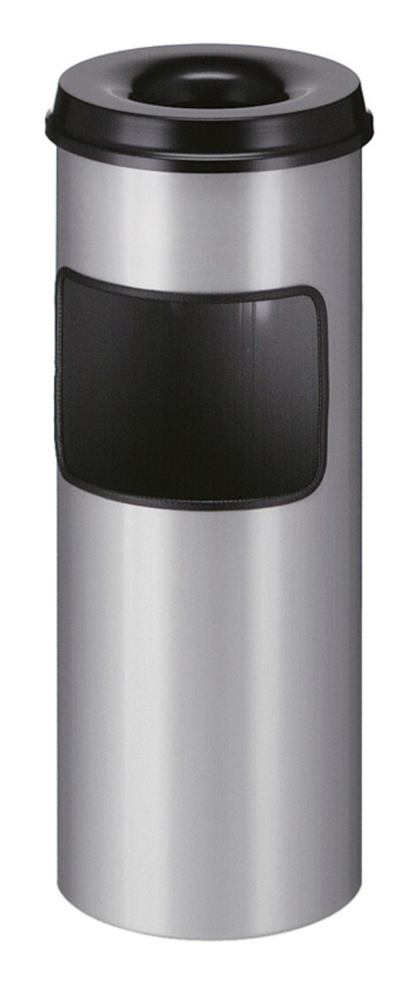 Ronde metalen as-papierbak met zwarte vlamdovende top. Voorzien van zwarte inzetbak. Inclusief doofzand.