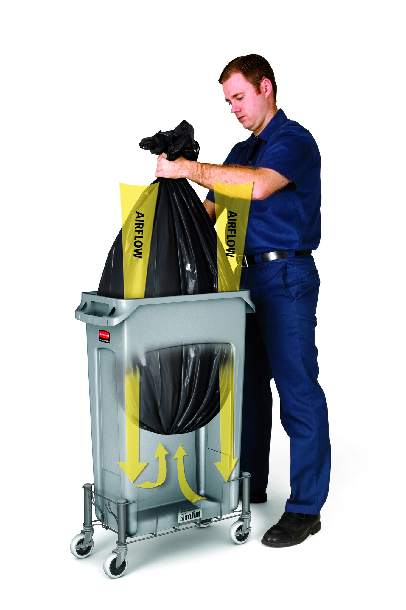 Kunststof Slim Jim container met luchtsleuven waardoor minder trekkracht nodig is om de afvalzak te verwijderen. Vier doortrekopeningen en treksluitingen maken vastbinden overbodig. Vaste gegoten grepen maken heffen en legen eenvoudiger.