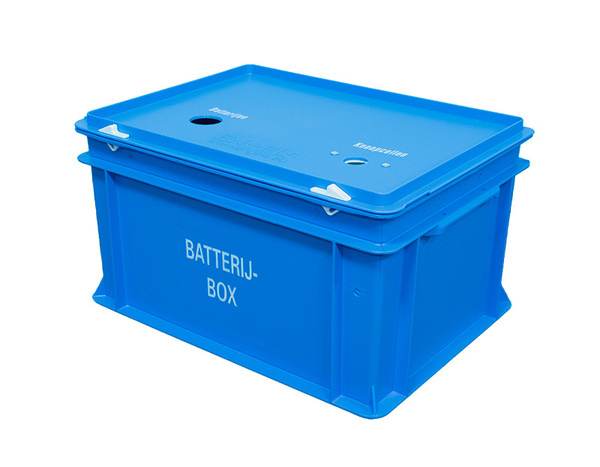 Kunststof batterijbox met deksel en aparte compartimenten voor gewone batterijen en knoopcelbatterijen.