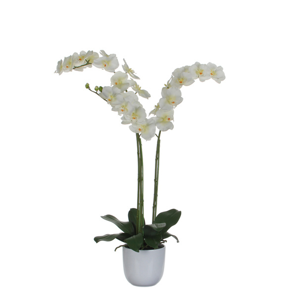 Stijlvolle bloeiende orchidee (3-taks) in witte sierpot. Hoogte 100 cm.