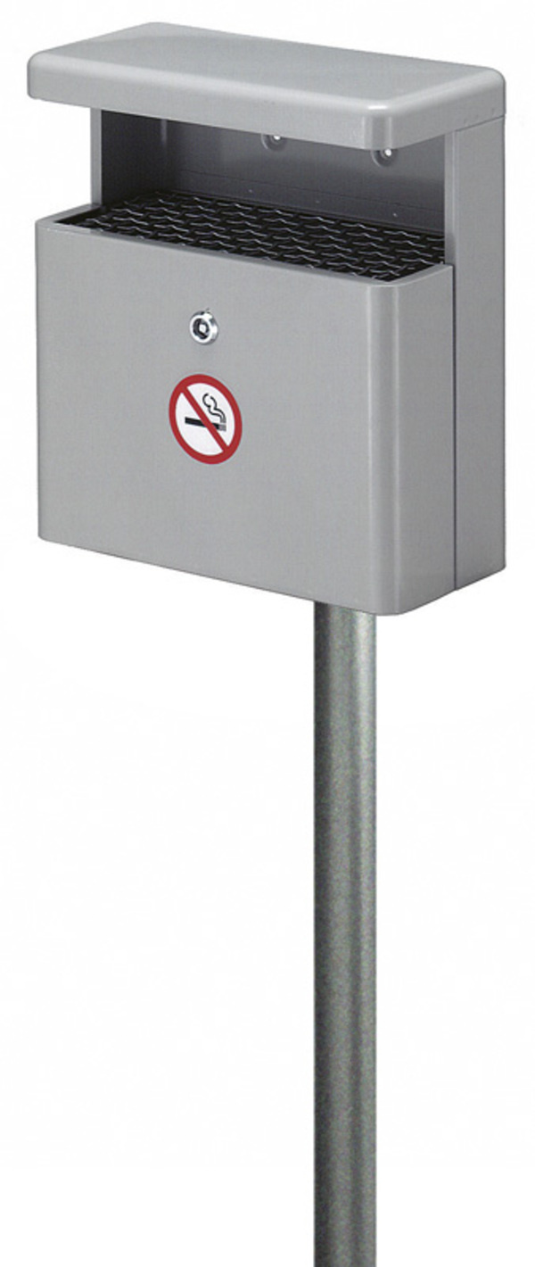 Aluminium buitenafvalbak voor as en sigaretten met metalen binnenbak. Zowel paal- als wandbevestiging mogelijk.