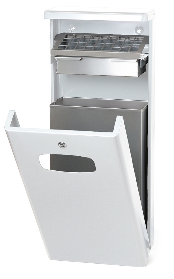 Aluminium afvalbak en asbak met aluminium binnenbak. Voor wandbevestiging. Afmeting binnenbak 36,5x18 cm, hoogte 56,5 cm.