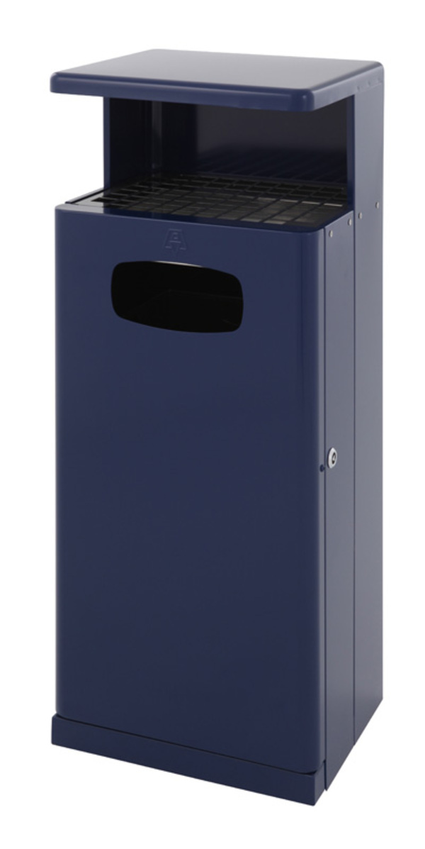 Aluminium afvalbak en asbak met aluminium binnenbak. Afmeting binnenbak 30x30 cm, hoogte 59 cm.