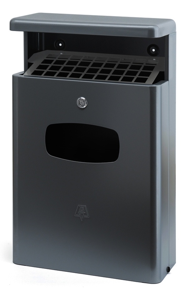 Aluminium afvalbak en asbak met aluminium binnenbak. Voor wandbevestiging. Afmeting binnenbak 36x18 cm, hoogte 26 cm.