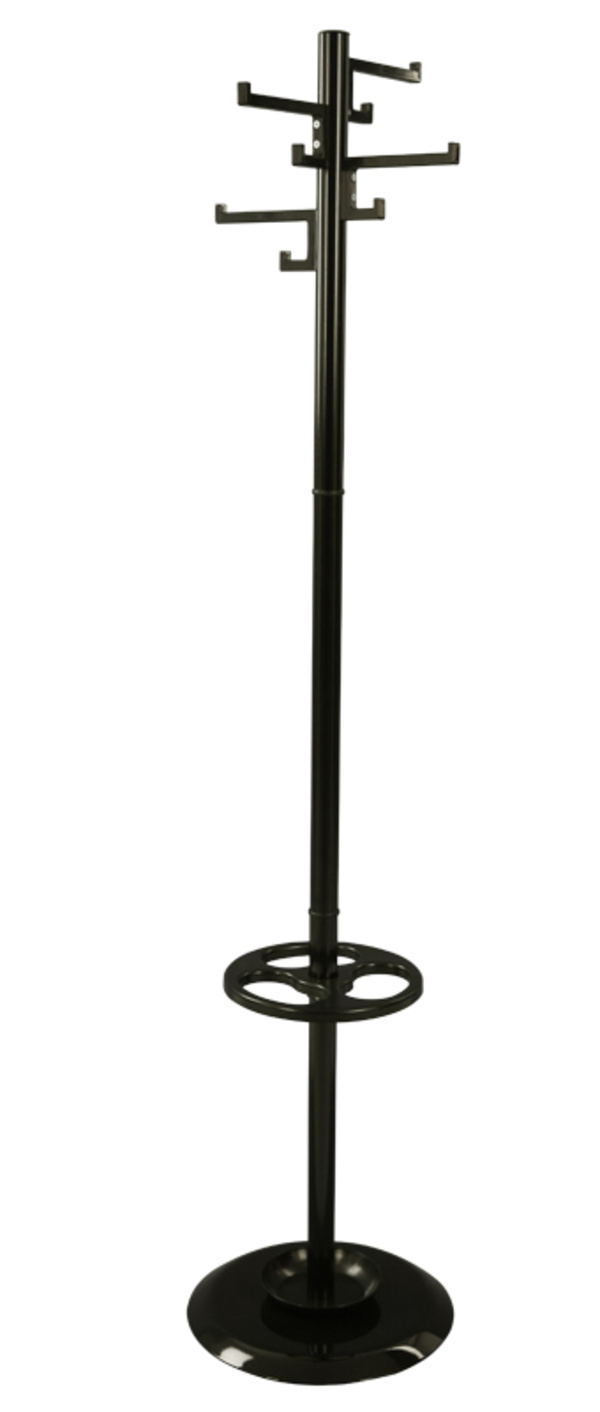 Staande kapstok op een voet van porselein met vier dubbele kunststof haken. Voorzien van kunststof parapluhouder met lekplateau. De kapstok wordt ongemonteerd geleverd.