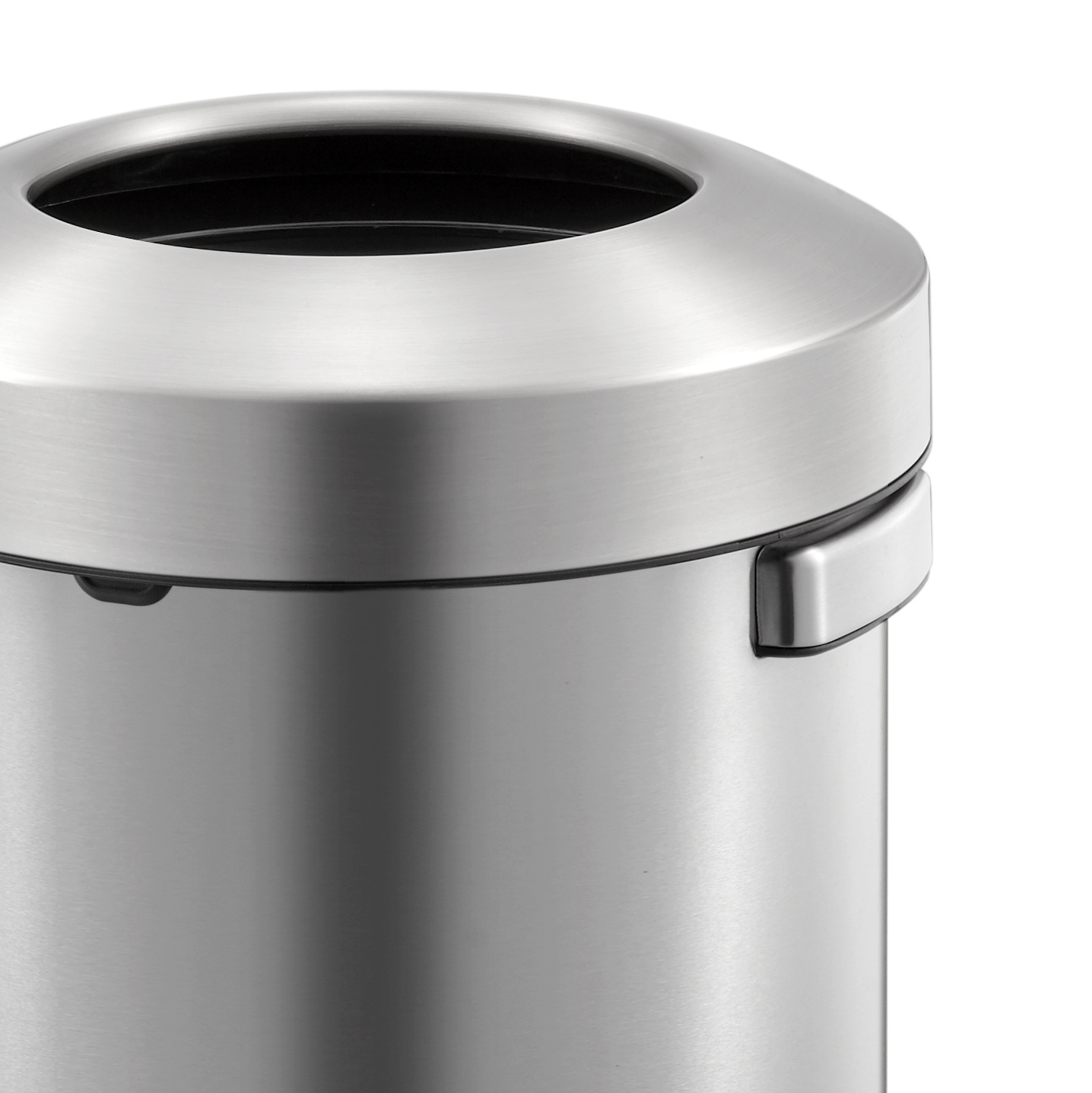 Stijlvolle open top afvalbak van geborsteld RVS met fingerprint proof coating. Voorzien van een ruime opening, handige handvatten en een kunststof onderzijde die de vloer beschermd. De basis beschikt over een opening om de afvalzak te klemmen. De top heeft een kunststof binnenring die hygiënisch aansluit op de afvalzak/-bak.