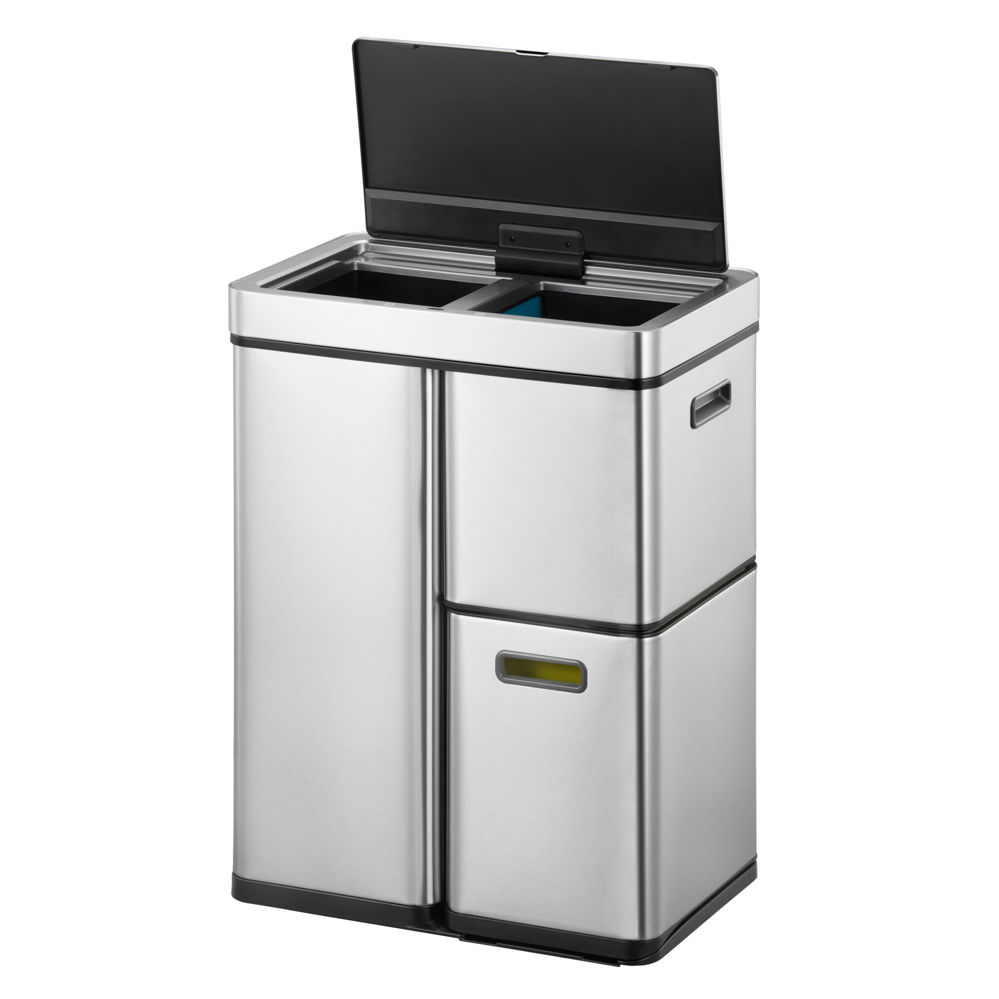 Een stijlvolle sensor afvalbak voor afvalscheiding van geborsteld RVS voorzien van fingerprint proof coating. Een ideaal gestapeld ontwerp afvalscheider voor optimale ruimtebesparing. Het deksel geeft toegang tot een ruim compartiment met kunststof binnenemmer van 30 liter en daarnaast een compartiment met binnenemmer van 15 liter. Hieronder zit een compartiment met binnenemmer van 15 liter, dat gemakkelijk toegankelijk is door de uittrekbare lade. Het sensormechanisme zorgt voor een hygiënisch gebruik en sluit het deksel geruisloos. Door het afneembare deksel zijn de afvalzakken eenvoudig te wisselen. Werkt op 6 AA batterijen (niet inbegrepen).