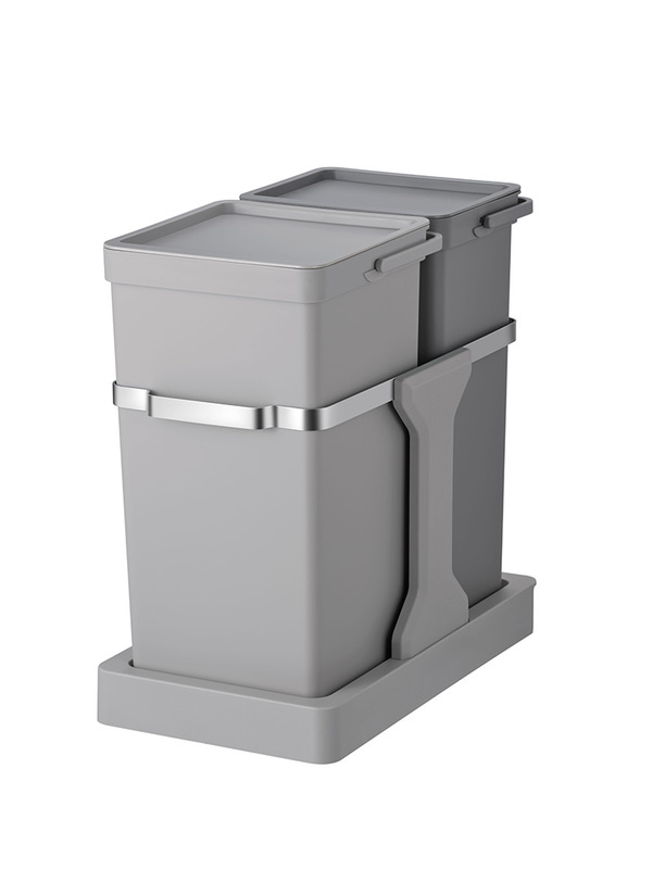 Inbouw afvalbak in stevige stalen contructie voor in een (keuken) kastje. Gemakkelijk uit te schuiven op de gladde kogellager geleiders, met de handvat aan de voorzijde. Voorzien van twee afvalbakken van 20L en 15L voor het scheiden van het afval.